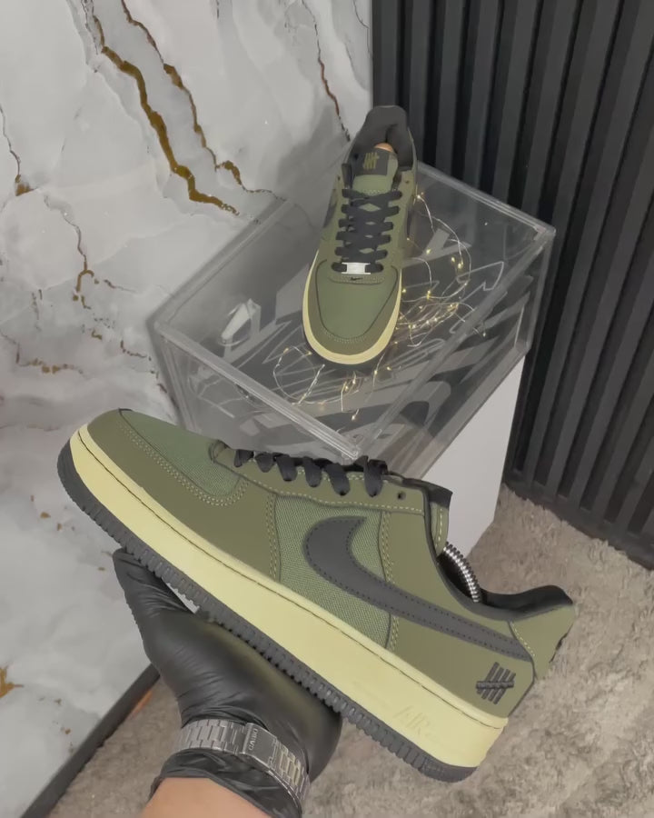 Este par fusiona lo clásico con lo callejero: una silueta Air Force 1 en tonos verde oliva con detalles en negro que le dan fuerza y carácter. El swoosh negro resalta sobre el upper texturizado, mientras que la media suela beige aporta contraste y estilo. En el talón, el logo de Undefeated con las cinco líneas marca su exclusividad. Un diseño robusto, urbano y con historia, ideal para quienes pisan fuerte y no pasan desapercibidos.
