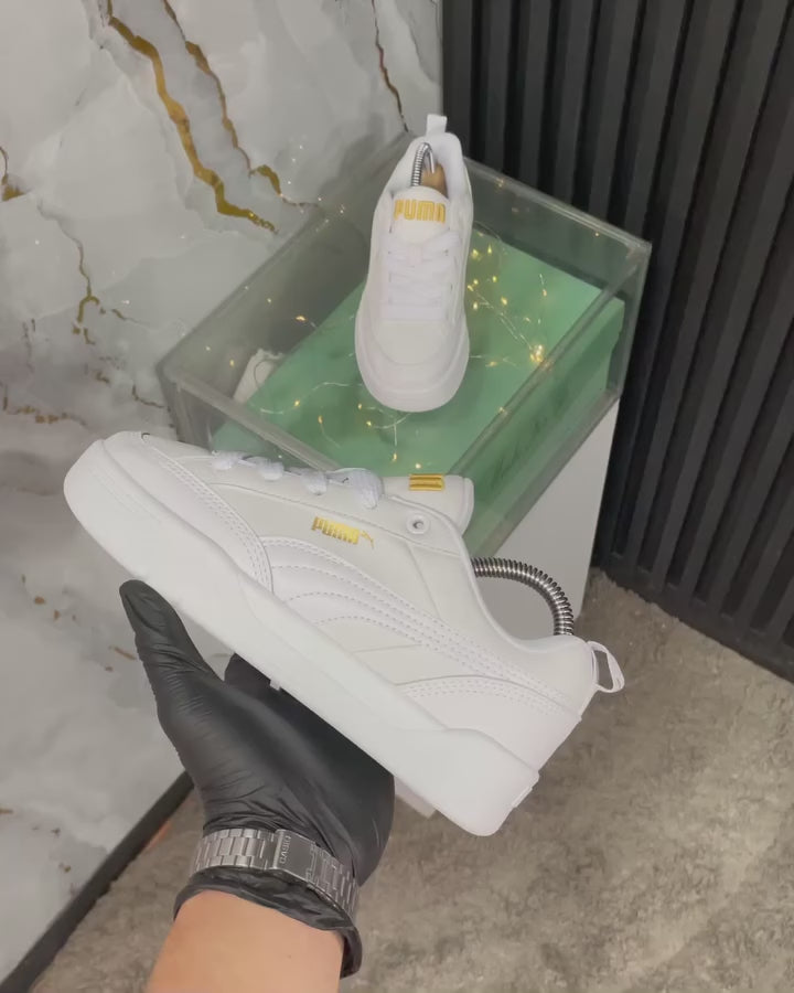 Este par de Puma en blanco puro transmite limpieza y versatilidad. Su diseño minimalista se complementa con una presentación llamativa: sobre una caja acrílica iluminada, con el fondo de mármol y detalles dorados que elevan el estilo.